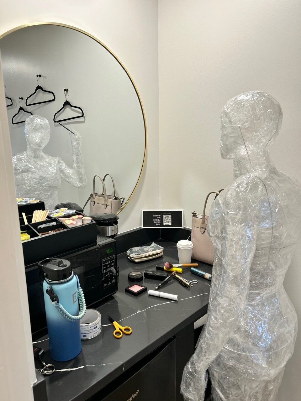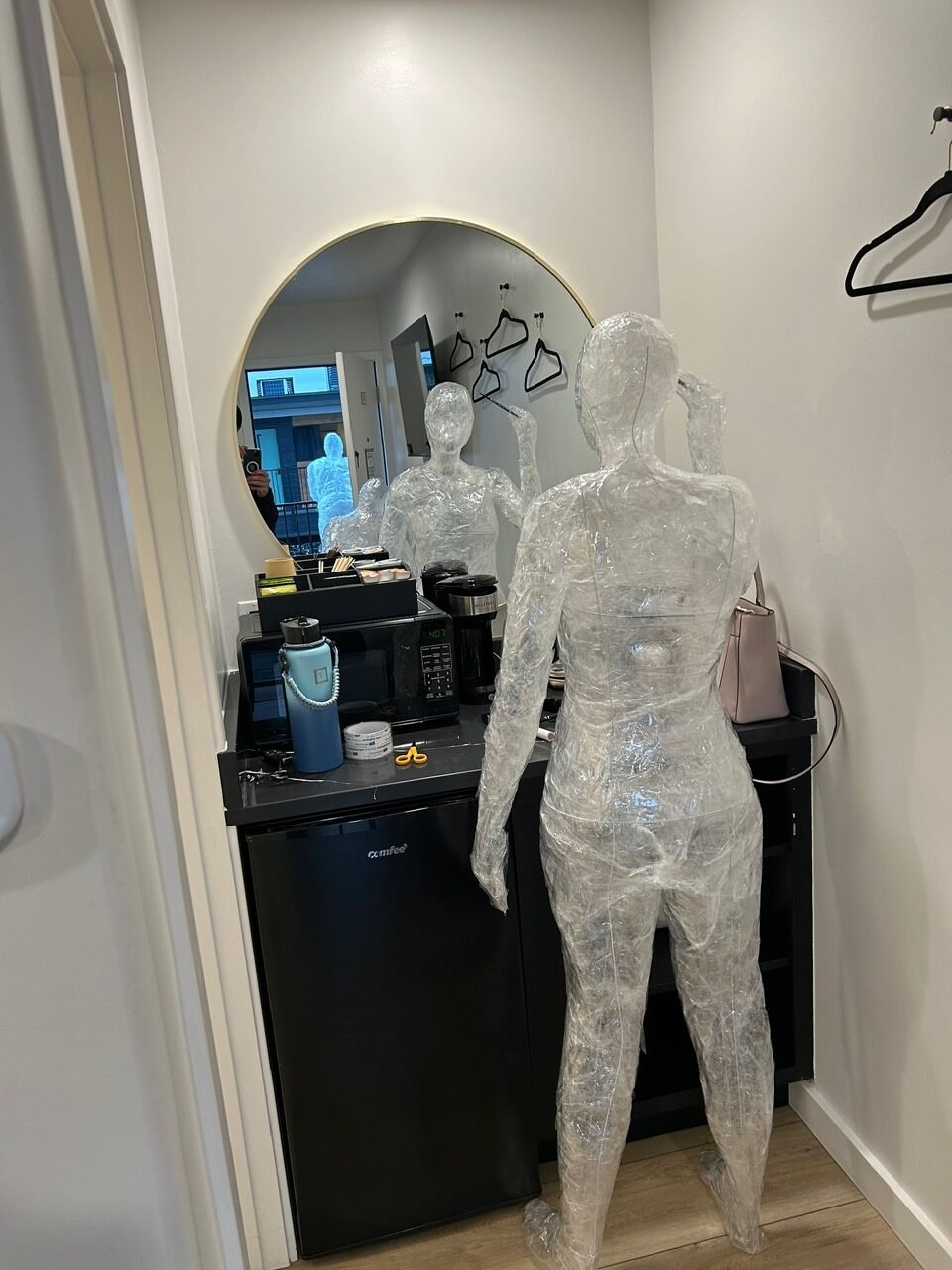 This site-specific installation was created in collaboration with fellow Boise Open Studios Collective member Andrew Groth. We were honored to be one of six artist teams selected for the inaugural partnership between Surel’s Place and the Arcadia Hotel in Garden City. The event, aptly titled ARTcadia, took place on December 5, 2025. From the beginning, our goal was to fully embrace the idea of site-specific work—creating an installation that could only exist in, and directly respond to, the hotel environment. Hotels are places where people temporarily inhabit space, collect experiences, and then leave with memories. This led us to ask a simple question: What if the hotel had memories too? If so, the only thing it could remember would be its guests. The ghost-like figures in the room represent those lingering memories—echoes of past occupants. Constructed from armature wire, Saran wrap, and packing tape, the figures possess a translucent, ethereal quality. Their semi-transparent surfaces catch and reflect light, creating a subtle sparkle that enhances their otherworldly presence. Each figure was formed by wrapping an actual body in Saran wrap, layering armature wire over the surface, and then taping the structure together. The taped form was carefully cut off the body and reassembled, resulting in a hollow, life-sized impression of human presence without permanence. This project was a meaningful and rewarding experience, and both Andrew and I hope that ARTcadia continues to grow and return as a yearly event.